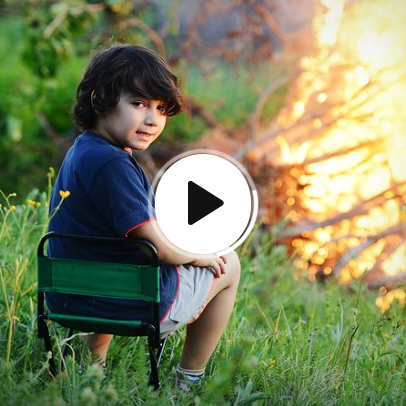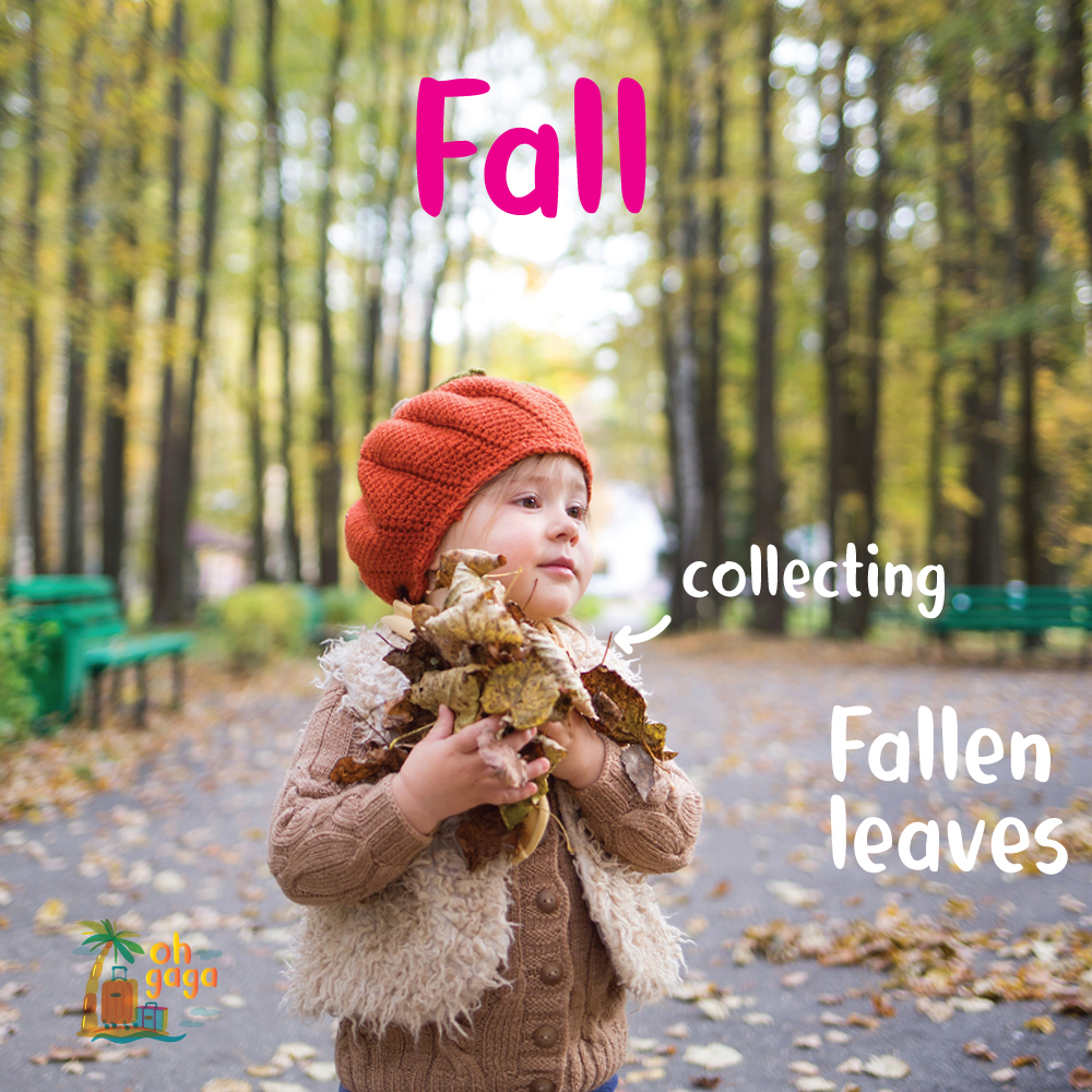 A little girl is gathering fallen leaves from the ground into her hands. (เด็กน้อยคนหนึ่งกำลังเก็บใบไม้ที่ร่วงหล่นจากพื้นดินมารวมไว้ในมือของเขา/เธอ)