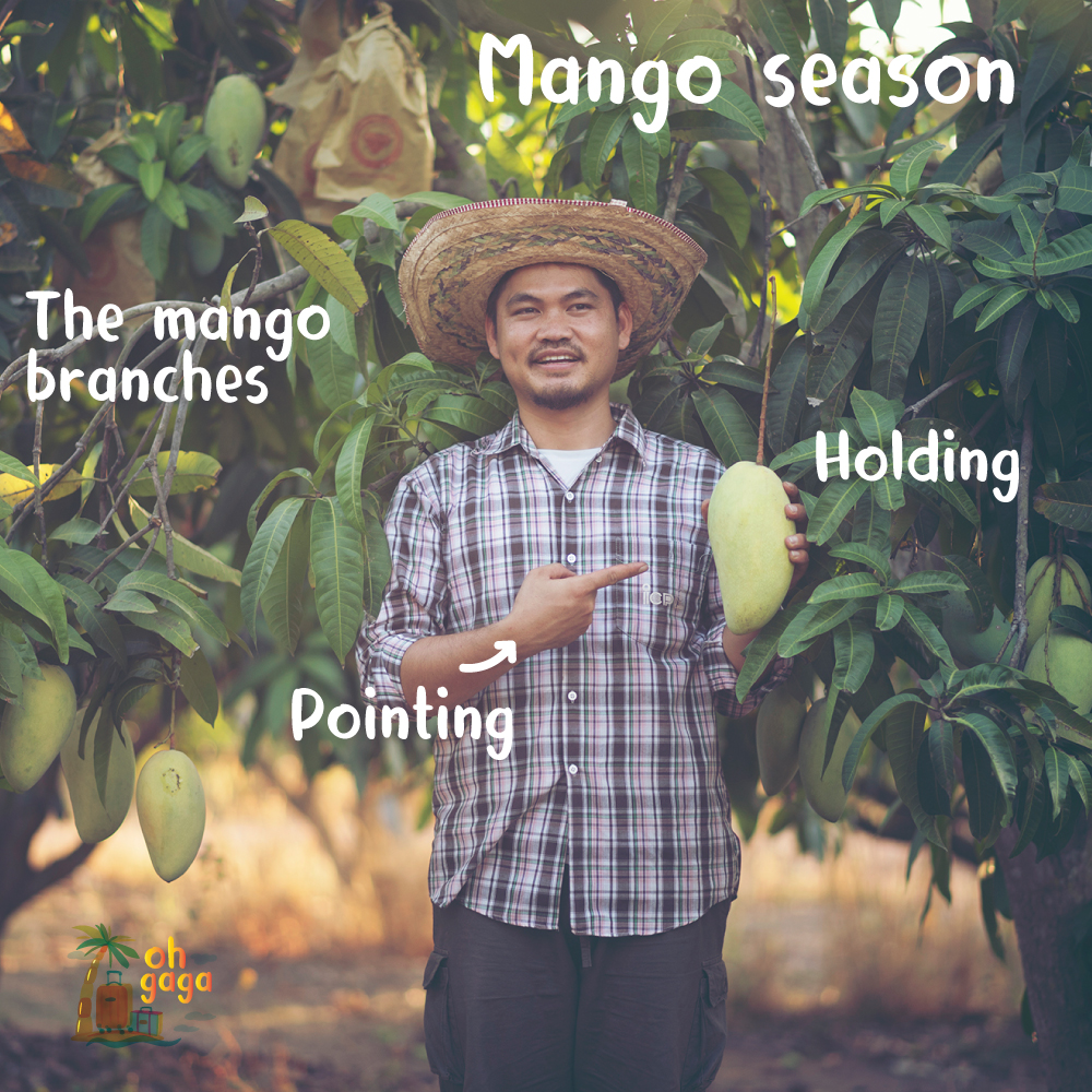 Look! There are so many mangoes now. It's mango season! (ดูสิ มีมะม่วงเยอะเลยตอนนี้ มันคือฤดูกาลของมะม่วง)