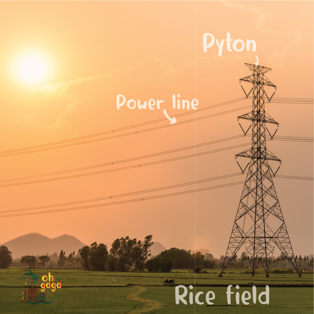 "Those tall towers are called pylons. They help send electricity to our homes and other places." (เสาสูงเหล่านั้นเรียกว่าไพลอน...