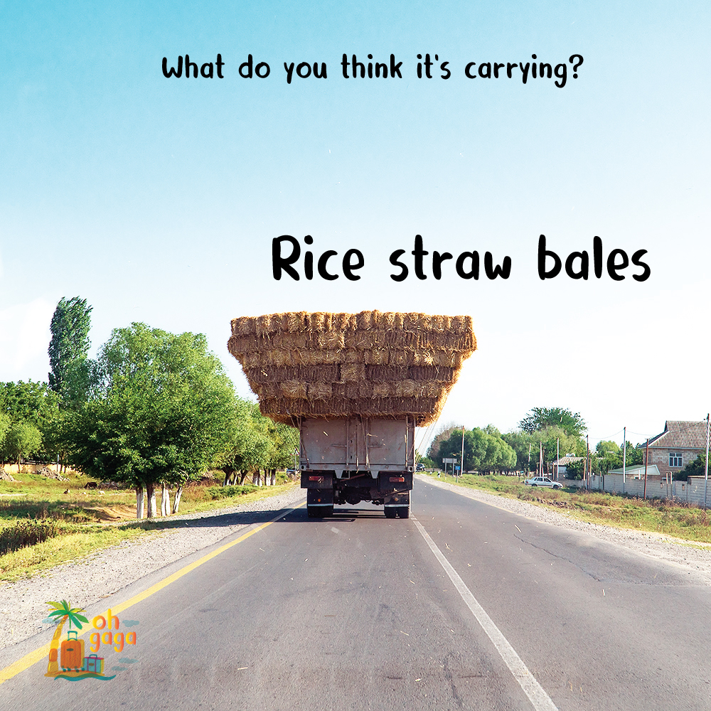 "The truck is carrying rice straw bales." "รถบรรทุกคันนั้นกำลังบรรทุกก้อนฟางข้าว"