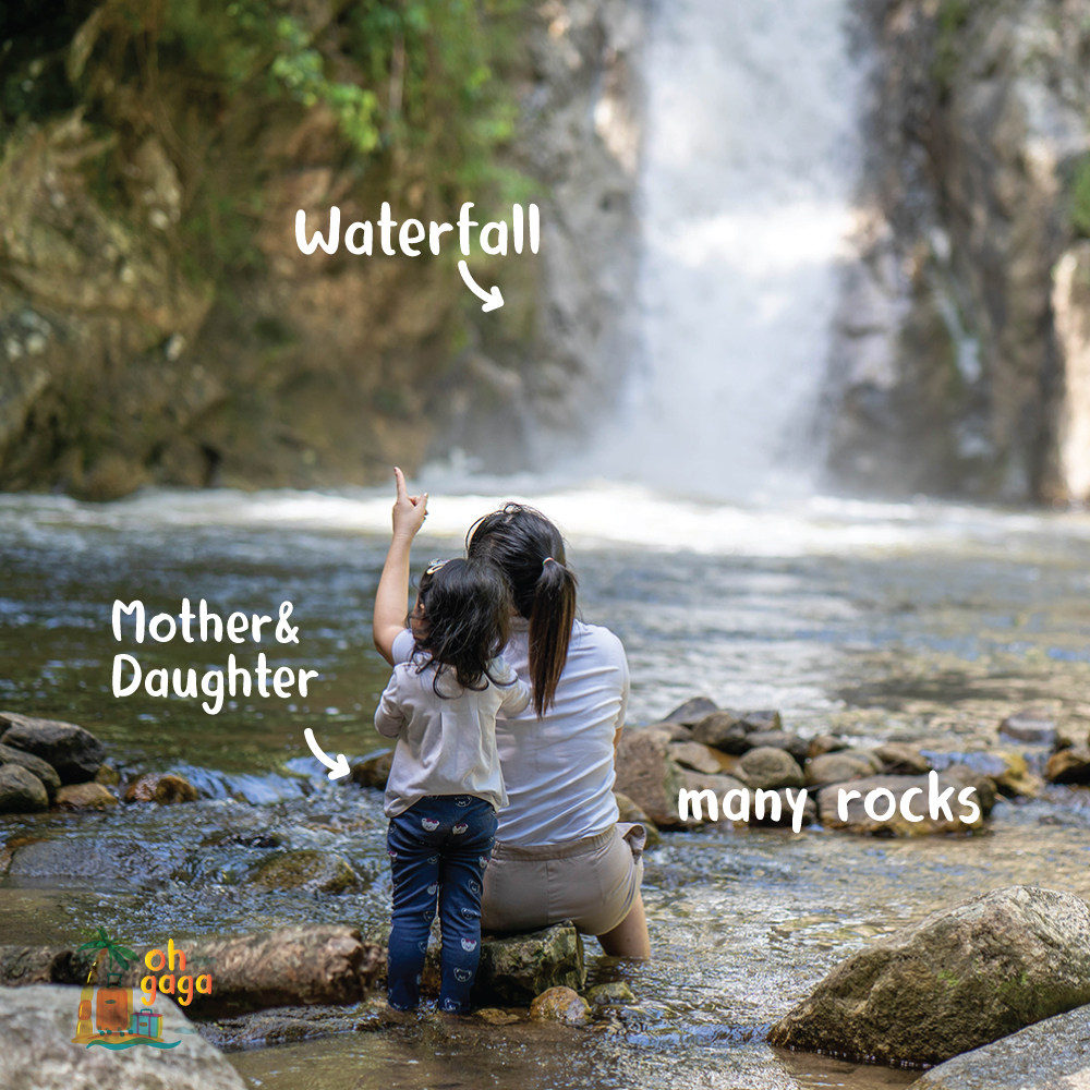 "A waterfall is when a river or stream falls down from a high place. It's like a waterslide for water!" "น้ำตกคือเมื่อแม่น้ำหรือลำธารไหลลงมาจากที่สูง มันเหมือนกับสไลเดอร์สำหรับน้ำ!"