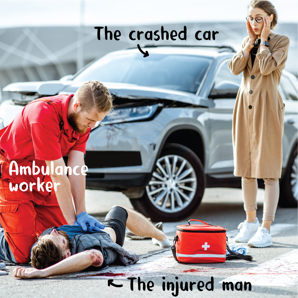 มีเจ้าหน้าที่กู้ภัยกำลังช่วยเหลือผู้ได้รับบาดเจ็บ”There is ambulance workers helping the injured, right now!“